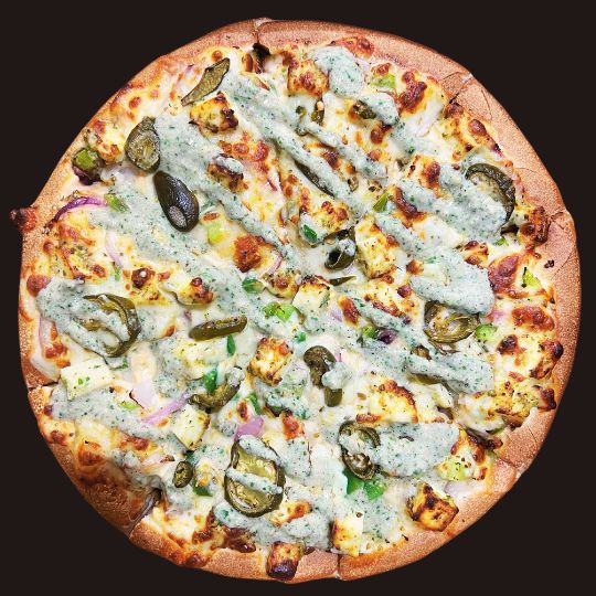Capsicum, red onion, chili flakes, marinated chicken, mozzarella cheese, jalapenos and tikka sauce on top