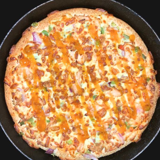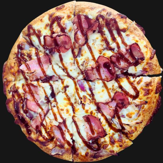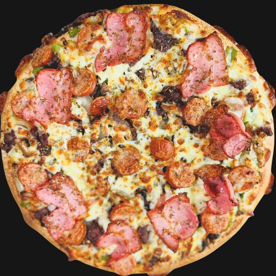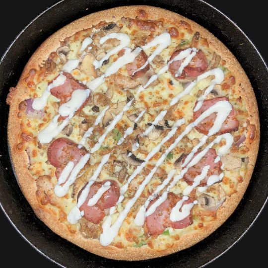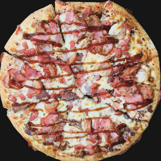 Cheese & Garlic base, pepperoni, ham, beef, Italian Sausages, Roasted Chicken, Bacon, cheese mozzarella, oregano, BBQ swirl on top