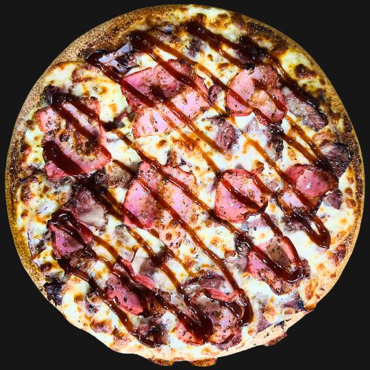 BBQ base sauce, red onion, Beef Brisket pieces, cheese mozzarella, bacon strips, BBQ swirl on top