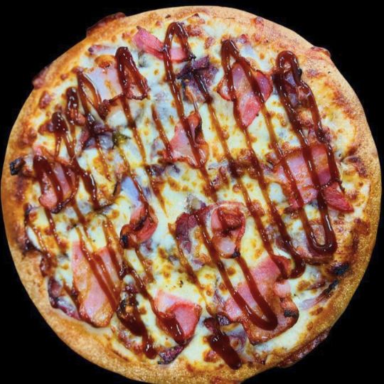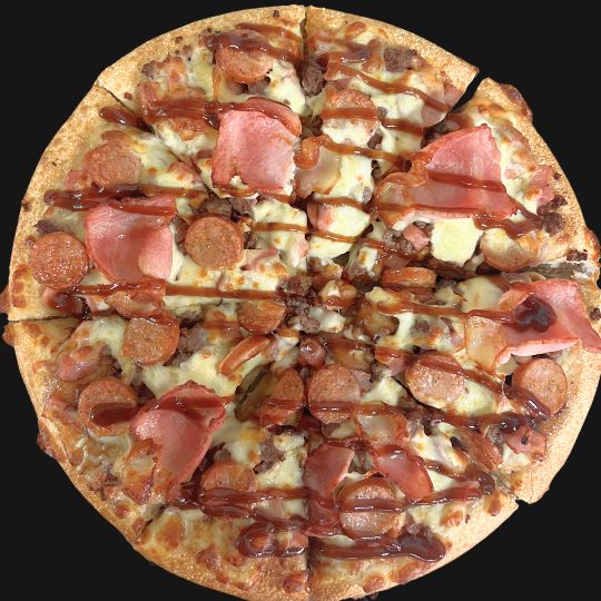 BBQ base, pepperoni, Italian sausages, grounded beef, ham, bacon strips, cheese mozzarella, BBQ swirl on the top