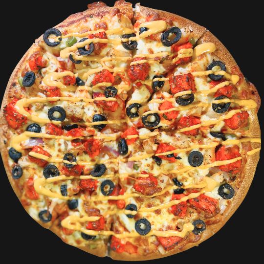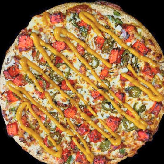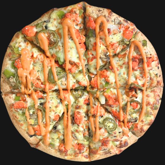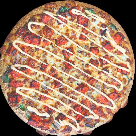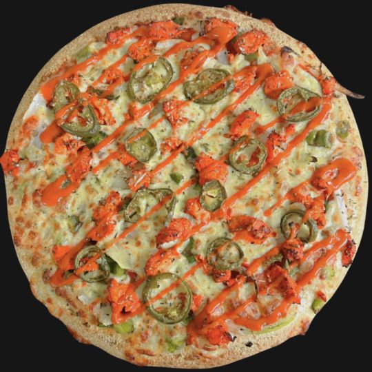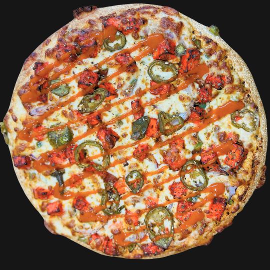 Capsicum, red onion, chili flakes, marinated chicken, mozzarella cheese, jalapenos and tikka sauce on top