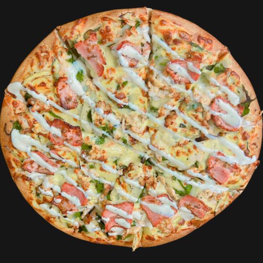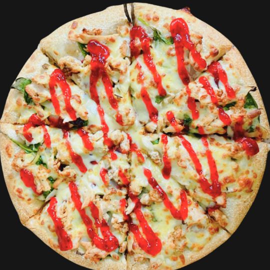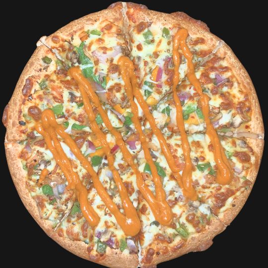 Pizza sauce, Roasted chicken, red onion, capsicum, cheese mozzarella topped with apricot sauce swirl