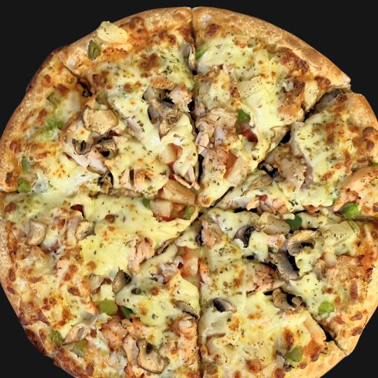 Pizza sauce, capsicum, mushroom, pineapple, Roasted chicken, cheese mozzarella, oregano