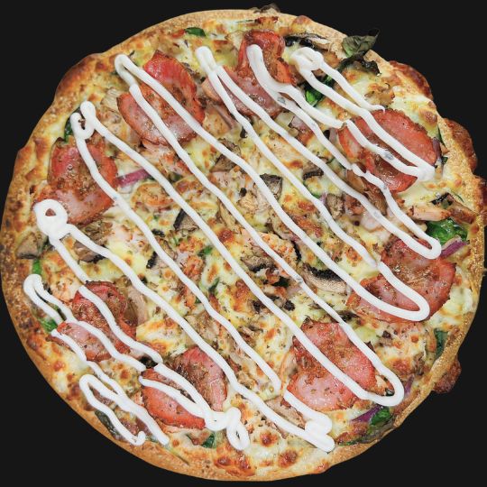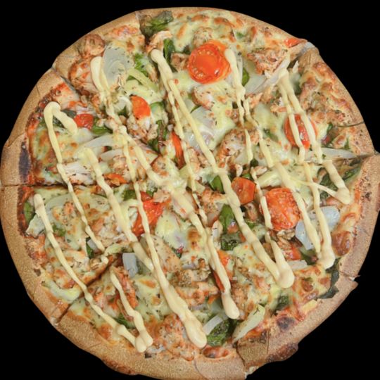 Creamy garlic base, baby spinach, red onion, mushroom, Roasted chicken, bacon, cheese mozzarella, oregano, garlic aioli swirl on top