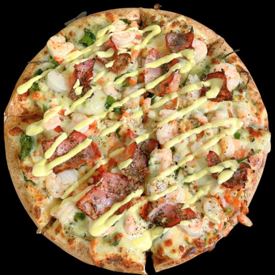creamy garlic base, fresh tomatoes, prawns, bacon strips, cheese mozzarella, hollandaise sauce on the top and oregano