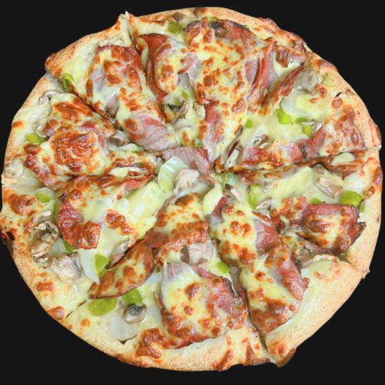 cheese sauce base, mushrooms, capsicum, red onion, over-loaded steak, cheese mozzarella